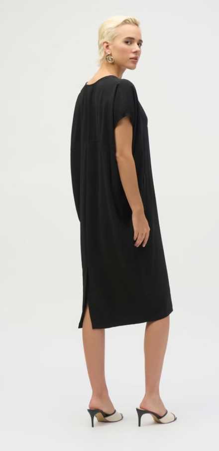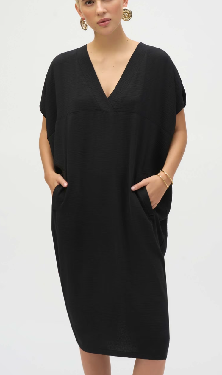 Discover the perfect blend of style and comfort with this Joseph Ribkoff mini dress. Designed in a shift silhouette, it features a chic v-neckline and short kimono sleeves for an effortlessly elegant look. Ideal for casual summer occasions, its plain pattern and minimalistic design make it a versatile addition to any wardrobe. Plus, practical pockets add functionality to this fashionable piece.