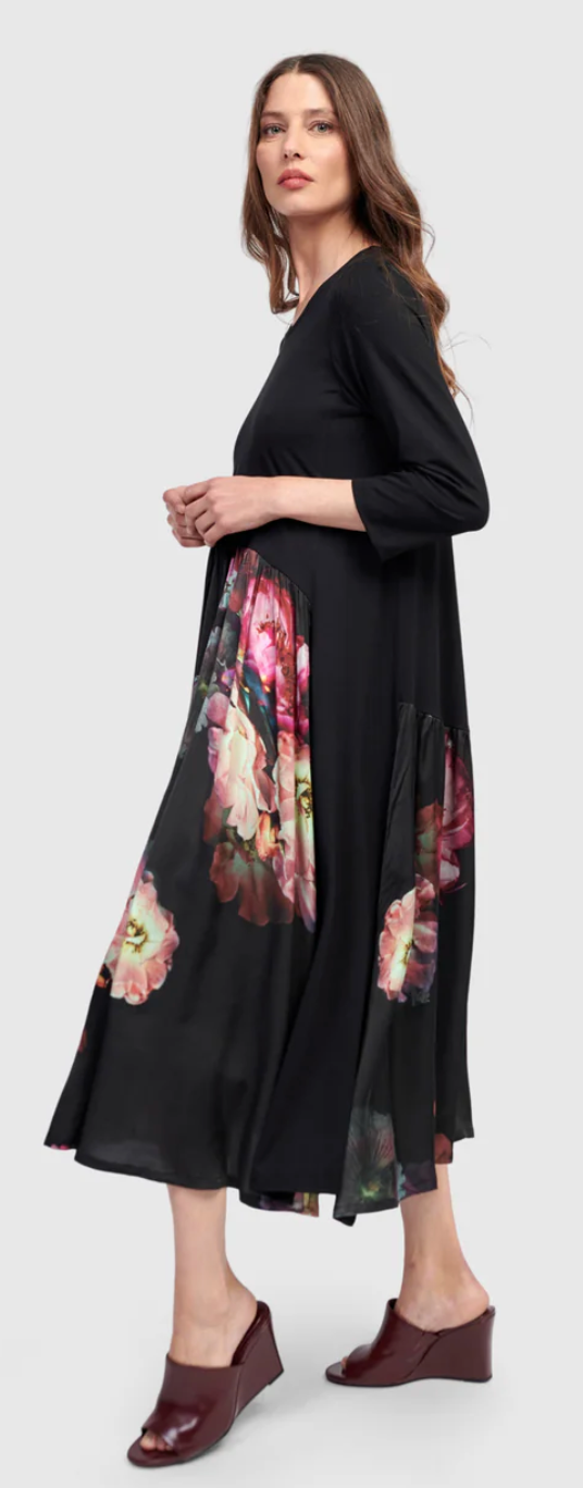 This easy pullover silhouette is made in a slinky knit with a crew neck, three quarter sleeves, hidden side pockets, and breezy side slits. Falls at a midi length with silk-feel woven skirting in a floral pattern. A relaxed, A-line fit with a flattering rounded waist completes this classic style.