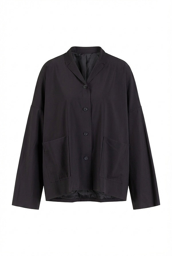 Side slits complement the wide, boxy cut of this minimalist jacket, made from highly stretchable high-tech microfiber jersey with dropped shoulders. The design features a small notched collar, a front button placket, and patch pockets. For a sleek office look, it can be paired with trousers in the same material. The wrinkle-resistant fabric makes it perfect for travel.