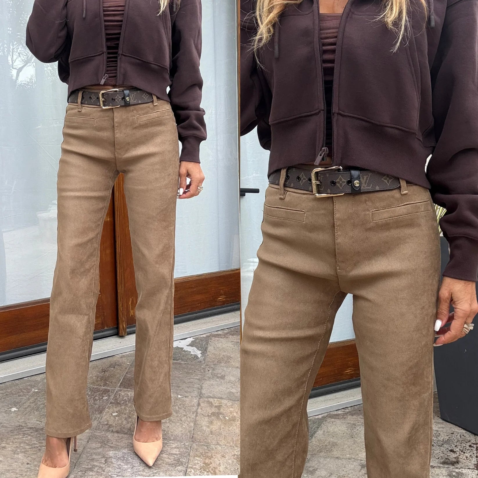 Your FALL Go TO! Style Tami with elastic waist, functional button and zipper. Flared bottom with a functional slit front pocket. Brown or Camel suede like feel but corduroy. 98% cotton 2% Lycra. Machine washable. Does not wrinkle or fade. Comfortable, stylish, and very flattering. Wear with or without belt. Wear with , booties, or heels. Wear it casual or dressy for evening. Try them and you will see why these pants have been the #1 selling item in boutiques all around the U.S. Inseam: 29", Rise: 10"