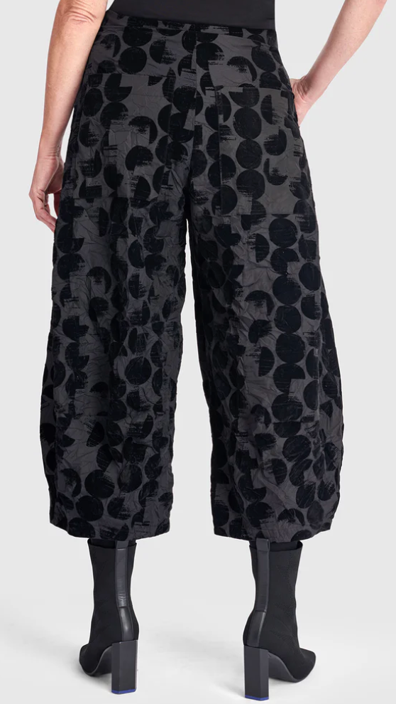 In crushed taffeta with distressed dot velvet flocking, these pants make a bold statement. The full classic lantern shape is defined by a paneled bottom, while a zip and button fly closure at the waist and an elasticized back ensure comfort and ease. Finished with rear patch pockets, they bring texture, shape, and artful detail to any look.