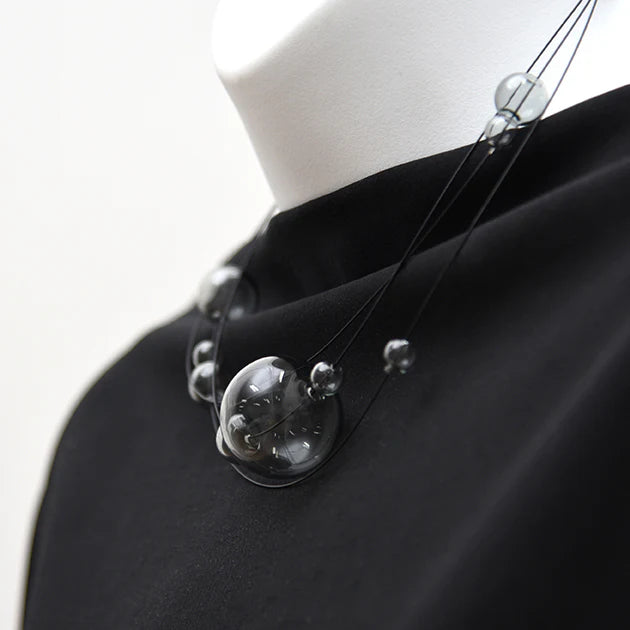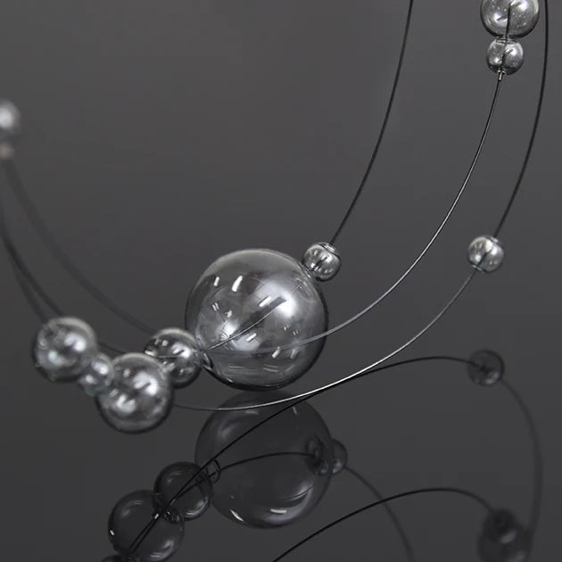 A stunning necklace with a floating-like layered design made up of three strands of carefully spaced glass orbs of assorted sizes. This piece is a dramatic ready-to-wear statement and features a magnetic clasp for easy on-and-off!