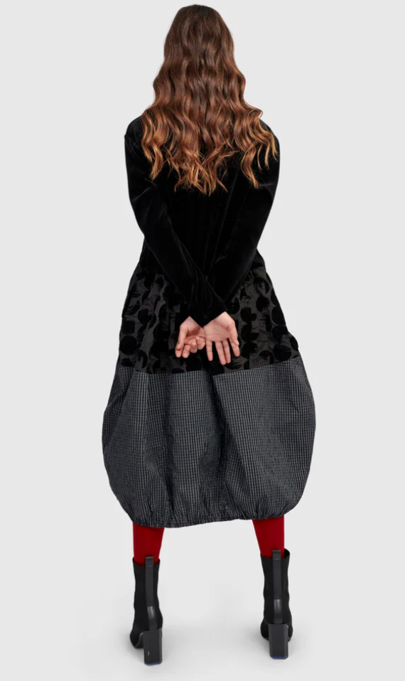 A softly sculpted cocoon dress that fuses stretch velvet and crinkled woven textures. The slim fit bodice transitions into a fuller skirt, creating easy movement while maintaining a refined shape. Patchwork piecing adds dimension and contrast, while a mock neck and long sleeves complete the transitional silhouette with understated elegance.