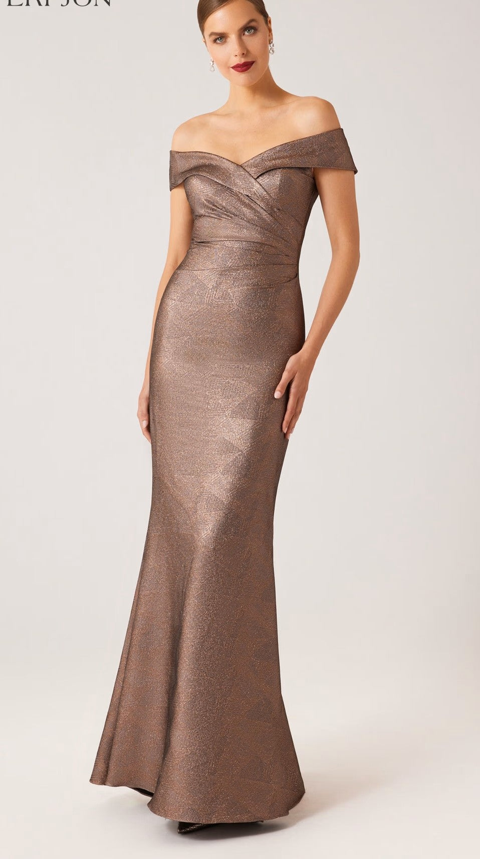Let your collarbone shine in our stretch metallic off-the-shoulder dress in neutral bronze and navy colorways! With a sweetheart neckline, ruching, a cinched waist, and trumpet skirt this dress hits all the marks. Combining elegance with a touch of glamour, this dress is perfect for a show-stopping entrance at your next event. Pair with diamond accents to get the best out of this dress.