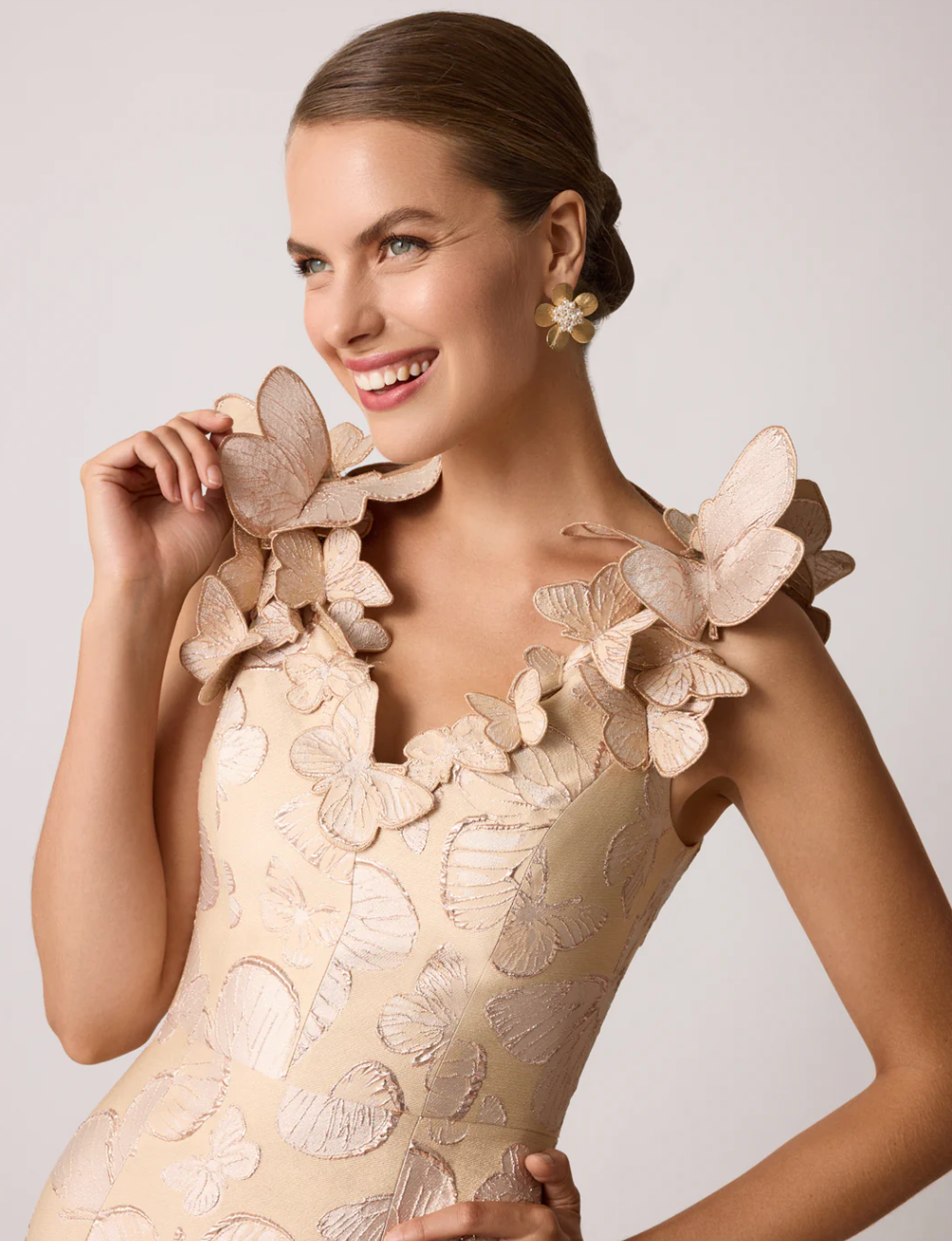 Fabric: Luxurious metallic jacquard with butterfly pattern trim along neckline