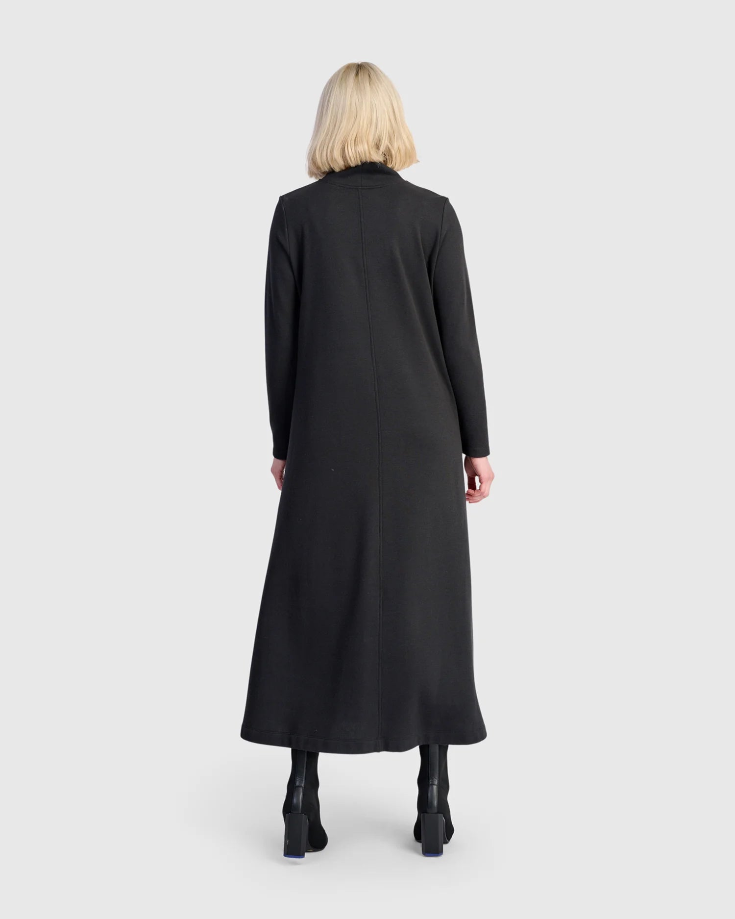 This full-length dress blends cozy ease with minimalist tailoring, shaped in an A-line cut that'softly drapes from a fitted bust. The mocha tone lends depth to the plush terry knit, brushed inside for next-to-skin softness. Finished with a mock neck, long sleeves, and discreet side pockets, it's a versatile go-to for effortless, elevated dressing.